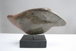 2010Abstracte vogel vorm in Braziliaans bruin/grijs speksteen op hardstenen sokkel.