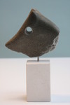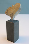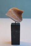 2012Sculptuur in Indisch speksteen. één zijde flinterdun en half transparant, andere zijde ruw en onbewerkt. Op hardstenen sokkel.