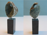 2011Op hardstenen sokkel donkergrijs. Materiaal: Chinees speksteen. Sculptuur 'Geestgrond' laat de rauwe kant van het leven zien, verbeeld in de ruwe zijde van de steen en is flinterdun. De andere zijde zacht en rond. In het midden in balans gebracht door twee doorkijkjes. Wat laat je van je Geestgrond doorschemeren? Prijs inclusief btw en commissie bij aankoop in galerie. Aankoop buiten exposities bij kunstenaar mogelijk.